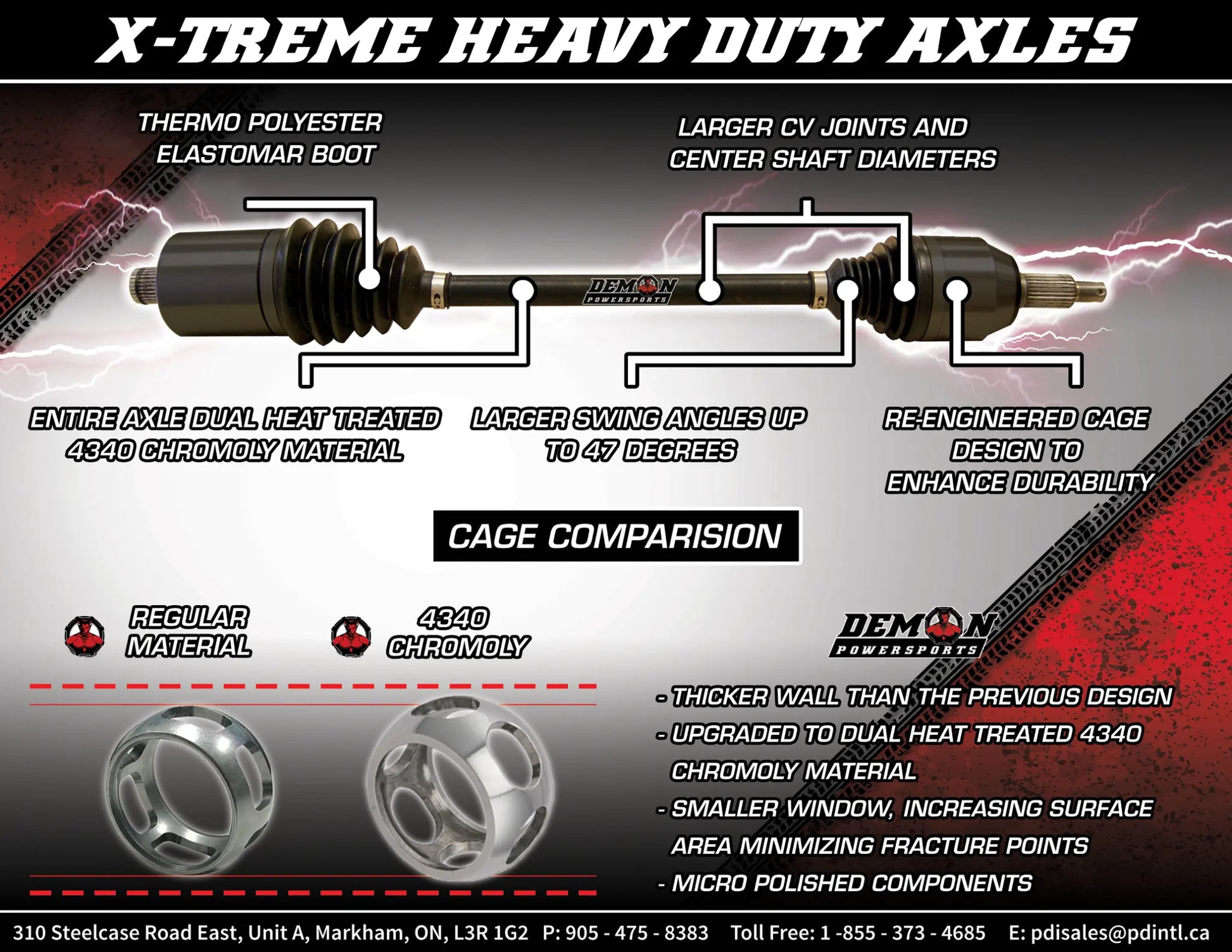 Built to withstand the rigors of off-road riding, the Demon Heavy-Duty X-Treme Axle features 20-30% larger components compared to standard heavy-duty axles. The axle is CNC machined with micro-polished internal components, ensuring smooth operation and reduced wear. The re-engineered cage design enhances durability, providing long-lasting performance. Manufactured entirely from 4340 chromoly steel and dual heat treated, this axle offers unmatched strength and resistance to breakage. The unique boot design helps reduce heat, maintaining optimal performance even during intense rides. With a swing angle up to 47°, this axle provides enhanced maneuverability. Upgrade to the Demon Heavy-Duty X-Treme Axle and experience the difference in performance and reliability.