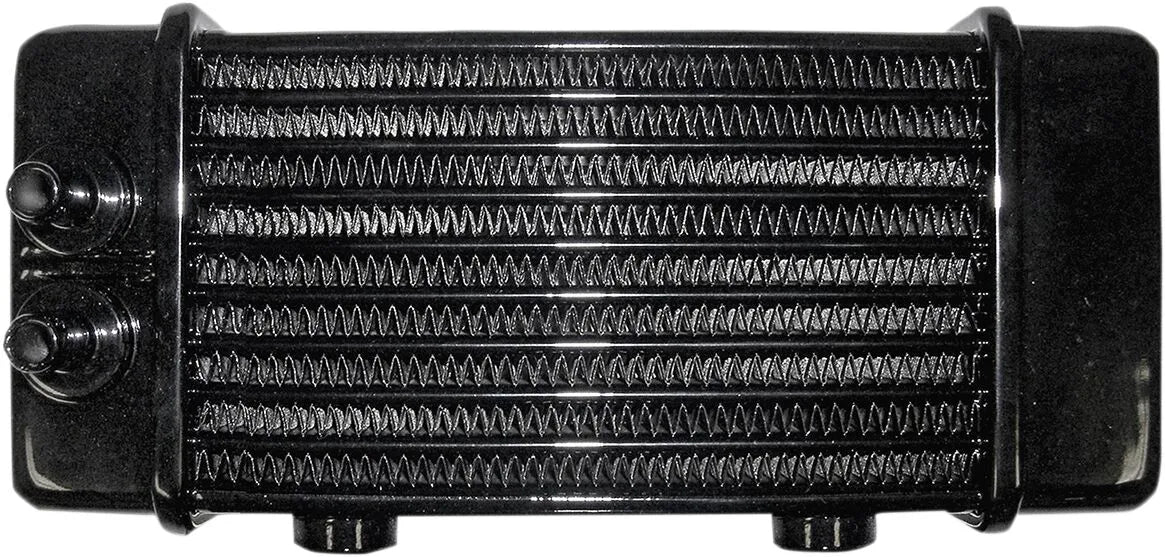 This 10-row oil cooler offers exceptional cooling performance, ensuring optimal oil temperature and extending engine life. The fully-brazed construction provides superior strength and durability, withstanding the rigors of high-performance riding. The gloss black powder-coated finish not only looks great but also adds an extra layer of protection against the elements. Designed for easy bolt-on installation, the Jagg Oil Coolers Universal Oil Cooler allows for flexible mounting in a bottom position, making it ideal for custom fabricators and racers seeking a reliable cooling solution for their motorcycles. Made in the USA, this oil cooler represents quality craftsmanship and performance.